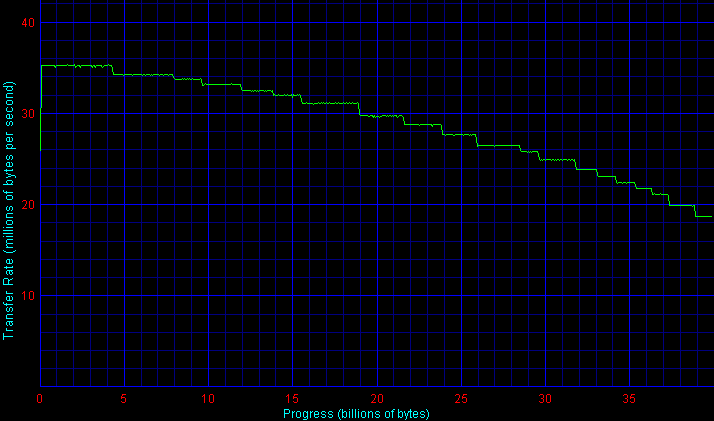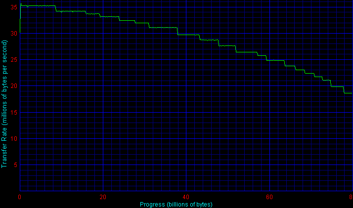 Графики для моделей WD800VE и WD400VE практически идентичны и насчитывают по 20 зон форматирования. Пока что производитель обходится «проверенной» традиционной технологией форматирования без использования «новомодных» адаптивных разметок, хотя Hitachi и Samsung уже при этой емкости пластин поспешили перейти на «переменную» плотность записи. По максимальной (усредненной за несколько «периодов» в начале диска), средней и минимальной скорости чтения данных с пластины диски расположились в следующем порядке: