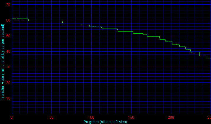 Сначала — графики скорости линейного чтения для трех последних поколений дисков WD Caviar SE с пластинами 107, 83, и 67 Гбайт соответственно (кликните по иконкам, чтобы посмотреть полноразмерные графики).