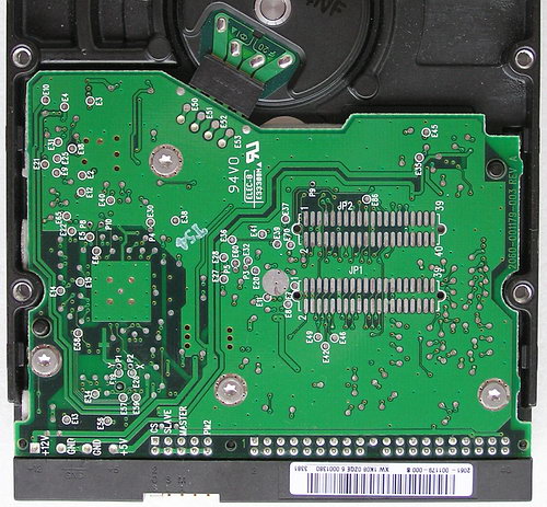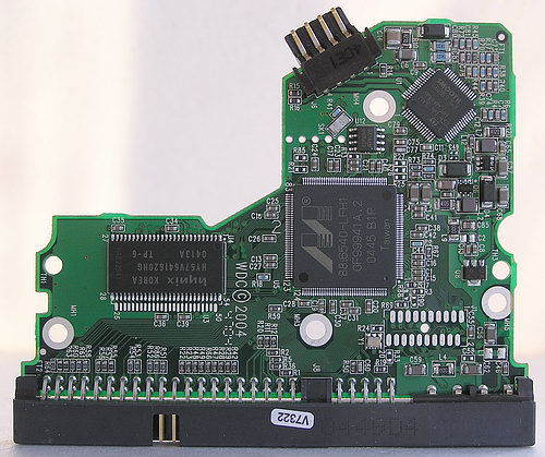 Очевидно, что плата контроллера диска существенно уменьшилась в размерах. Да и само содержимое платы контроллера претерпело заметные изменения даже по сравнению с моделью WD2500JB, выпущенной еще пару месяцев назад: