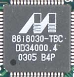 Она идентифицируется как Marvell 88i8030-TBC. Находим на сайте Marvell информацию по этому контроллеру — и читаем, что это «Parallel ATA to Serial ATA bridge». То есть мы получили по сути тот самый десятитысячник Parallel ATA, слухи о котором ходят уже года два! Только интерфейс к нему «прикрутили» более модный. Теперь становится понятно и близкое к разъему расположение. Остается только легкая грусть, от того , что не удасться насладиться вcеми прелестями полноценного поcледовательного интерфейса, реализованного на контроллере диска.