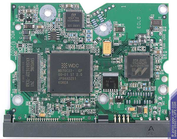 Первое, что бросается в глаза — развитые ребра охлаждения. Вообще говоря, на первый взгляд WD360GD больше напоминает SCSI диски, чем IDE. Это неудивительно — дизайн корпуса определяется в основном механикой, а не электроникой.