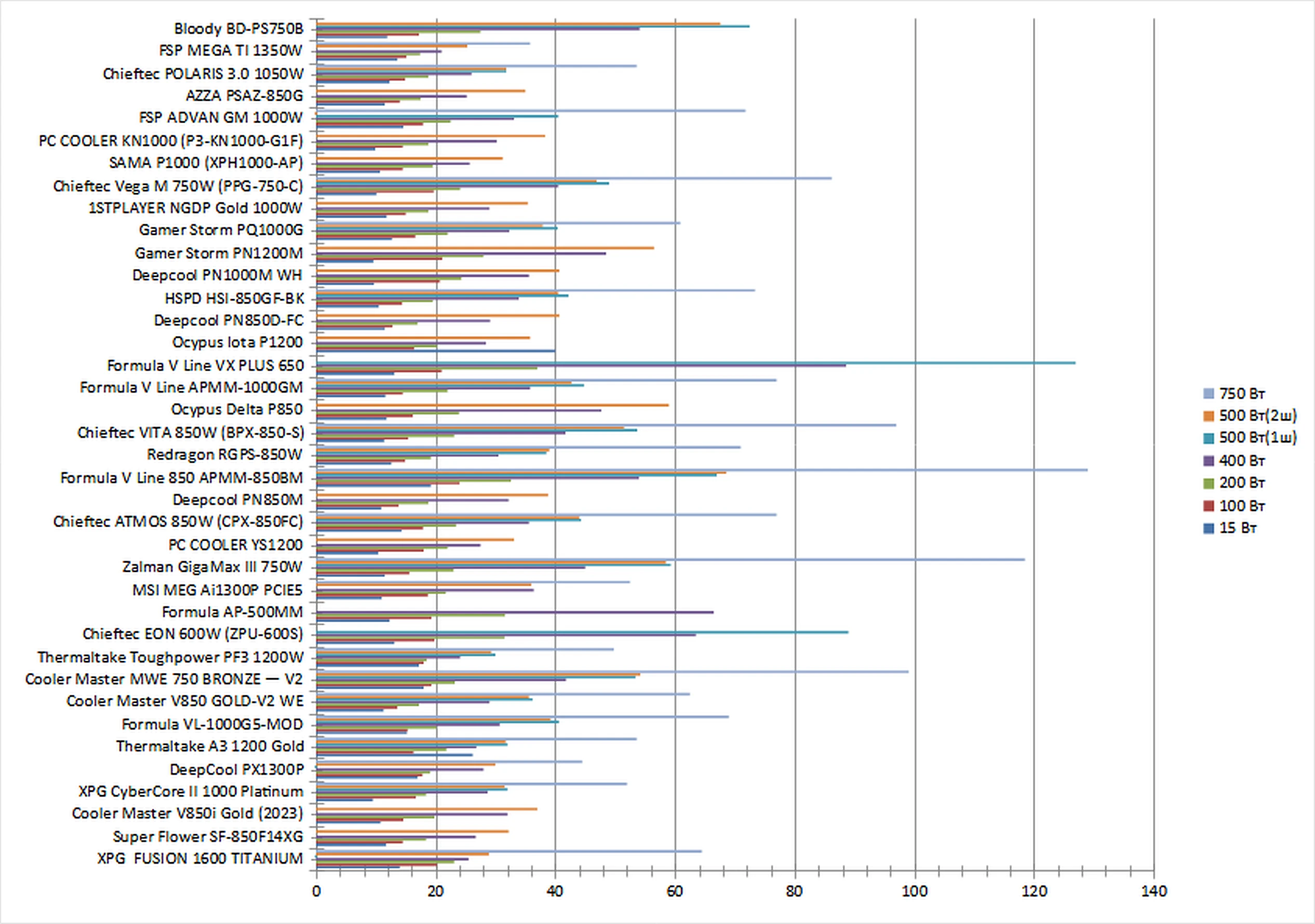 | Chieftec Atmos 850W (CPX-850FC) | 257 | 1033 | 1957 | 3816 | 4768 | 4765 | 7245 |