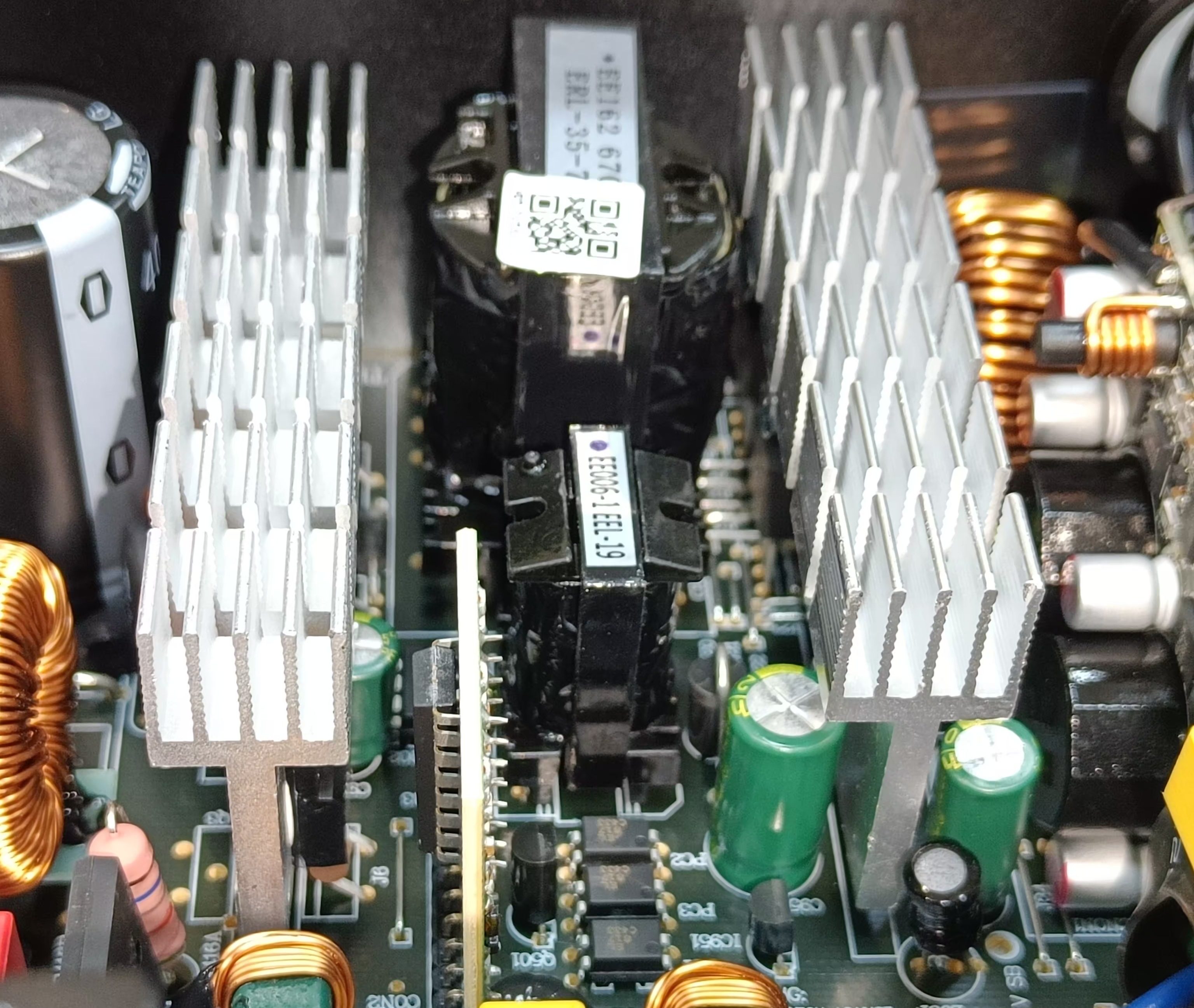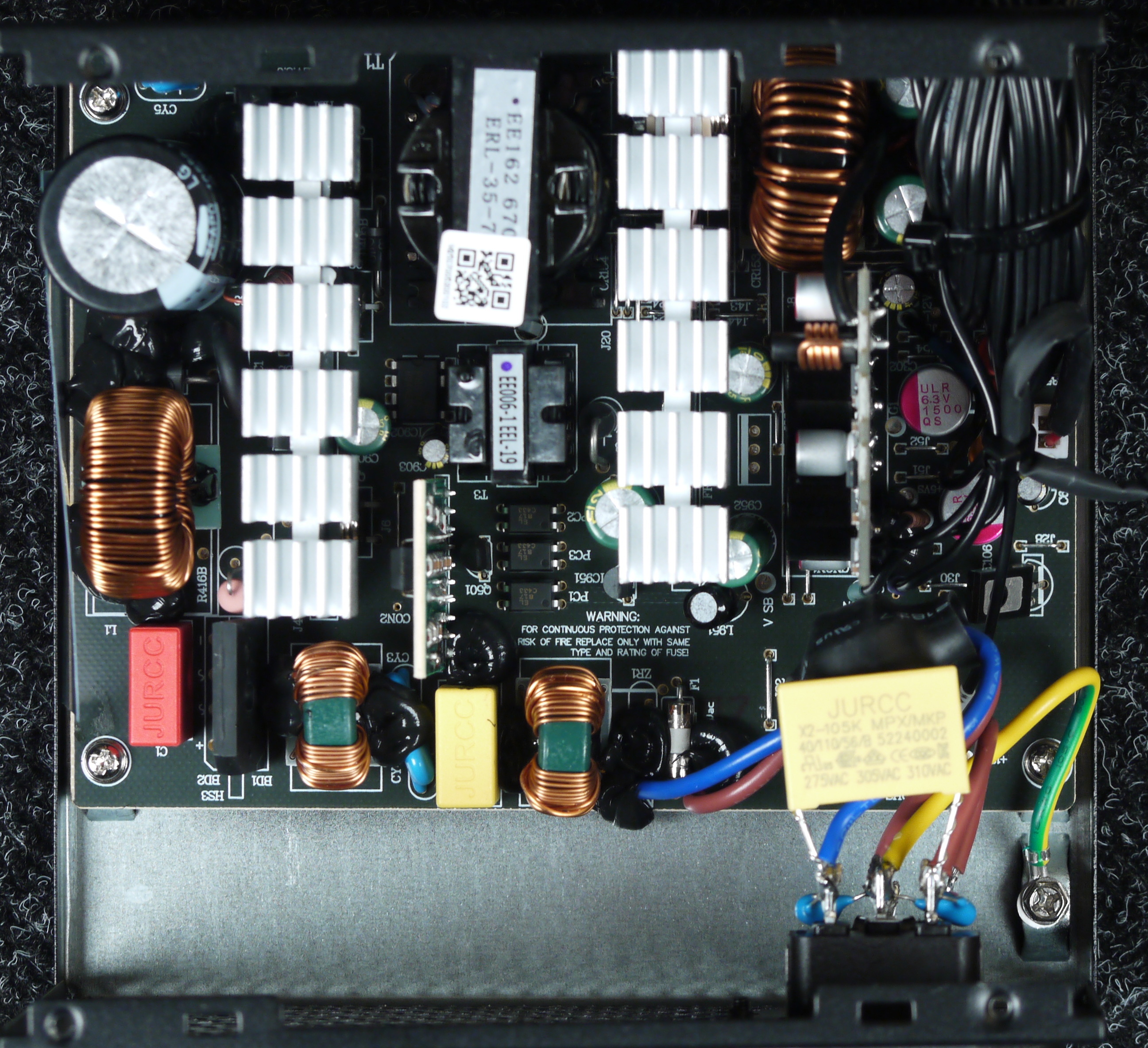 Конструкция блока питания тут не самая современная, но активный корректор коэффициента мощности и независимые импульсные преобразователи постоянного тока для линий +3.3VDC и +5VDC присутствуют.
