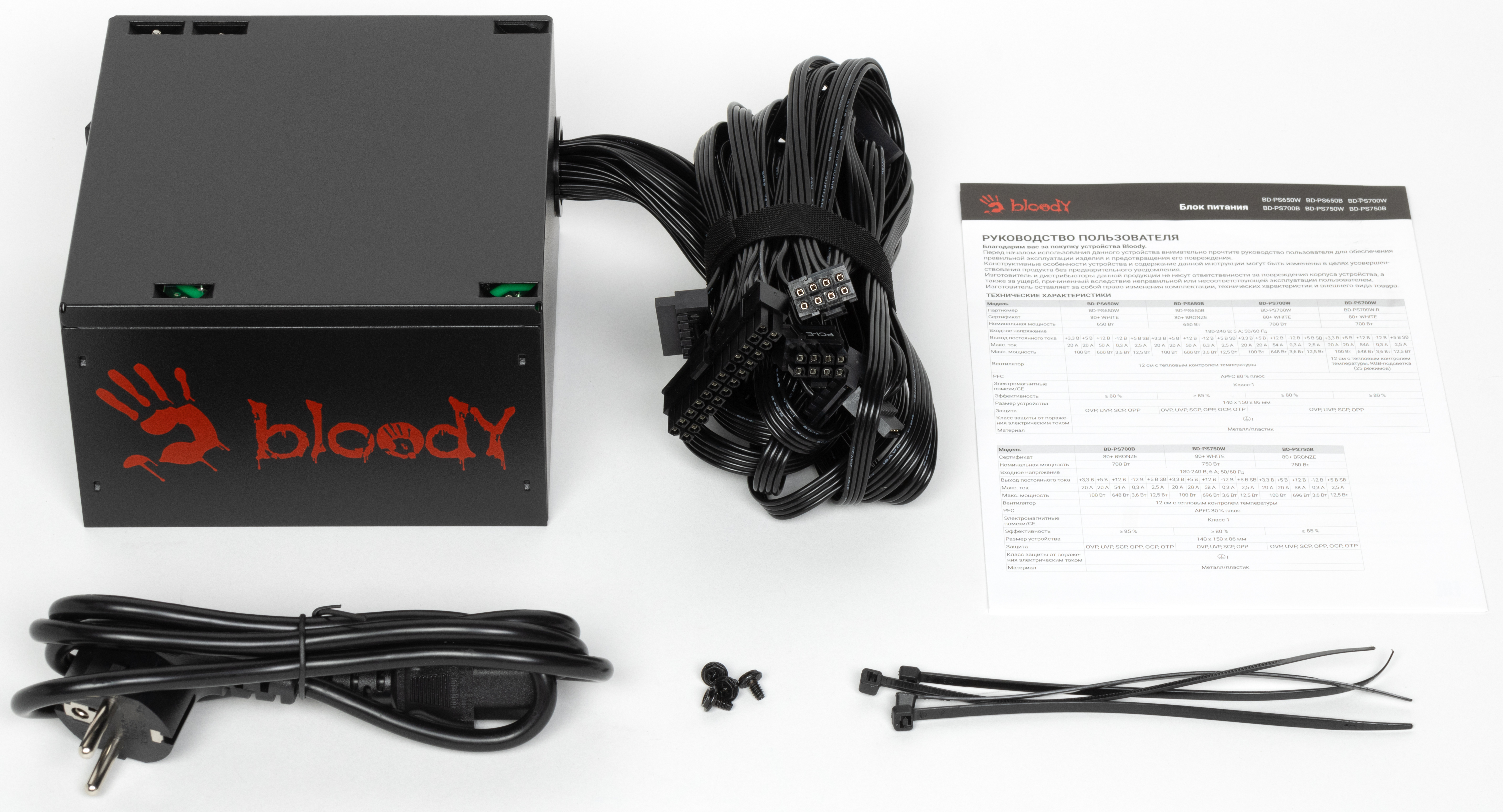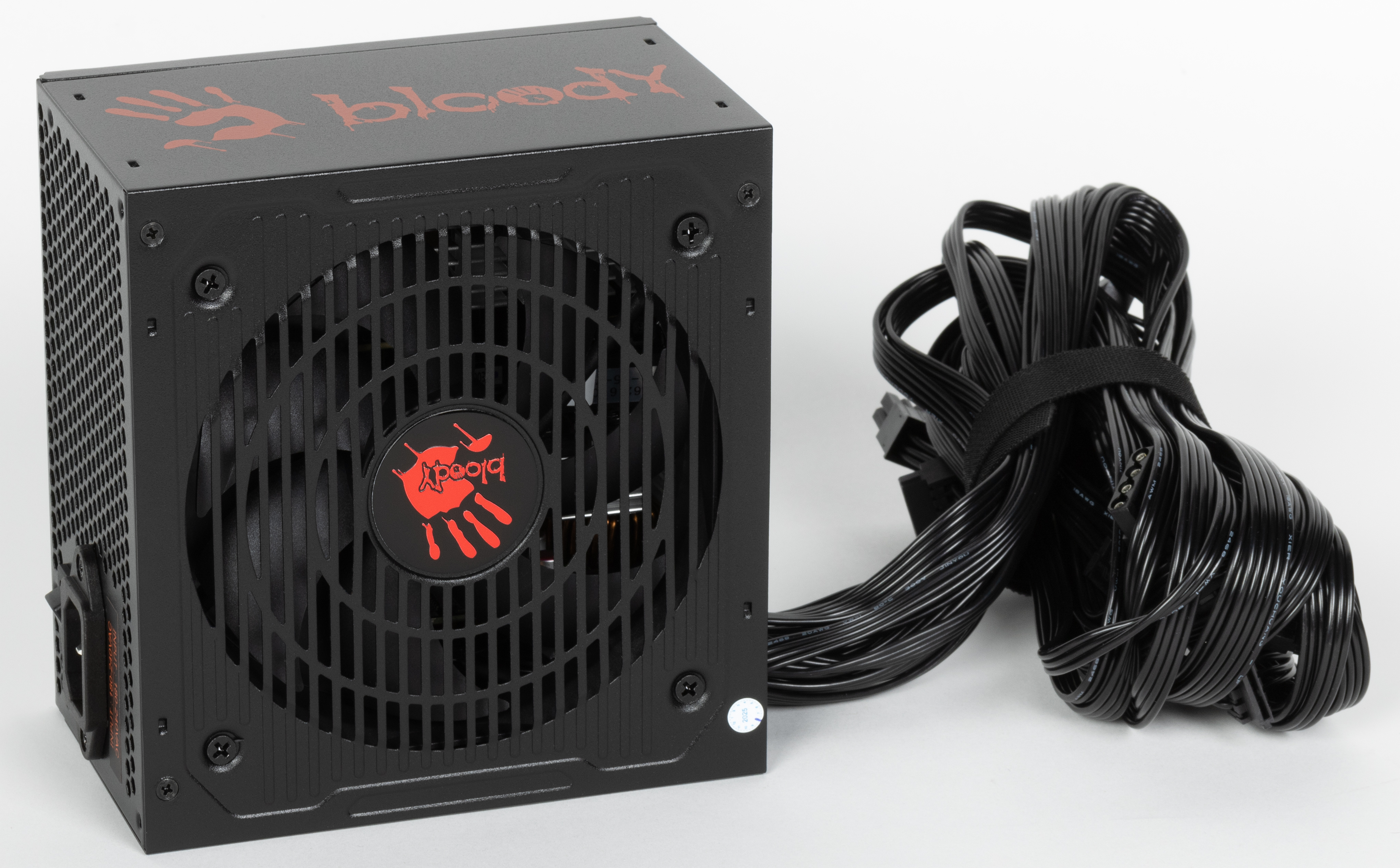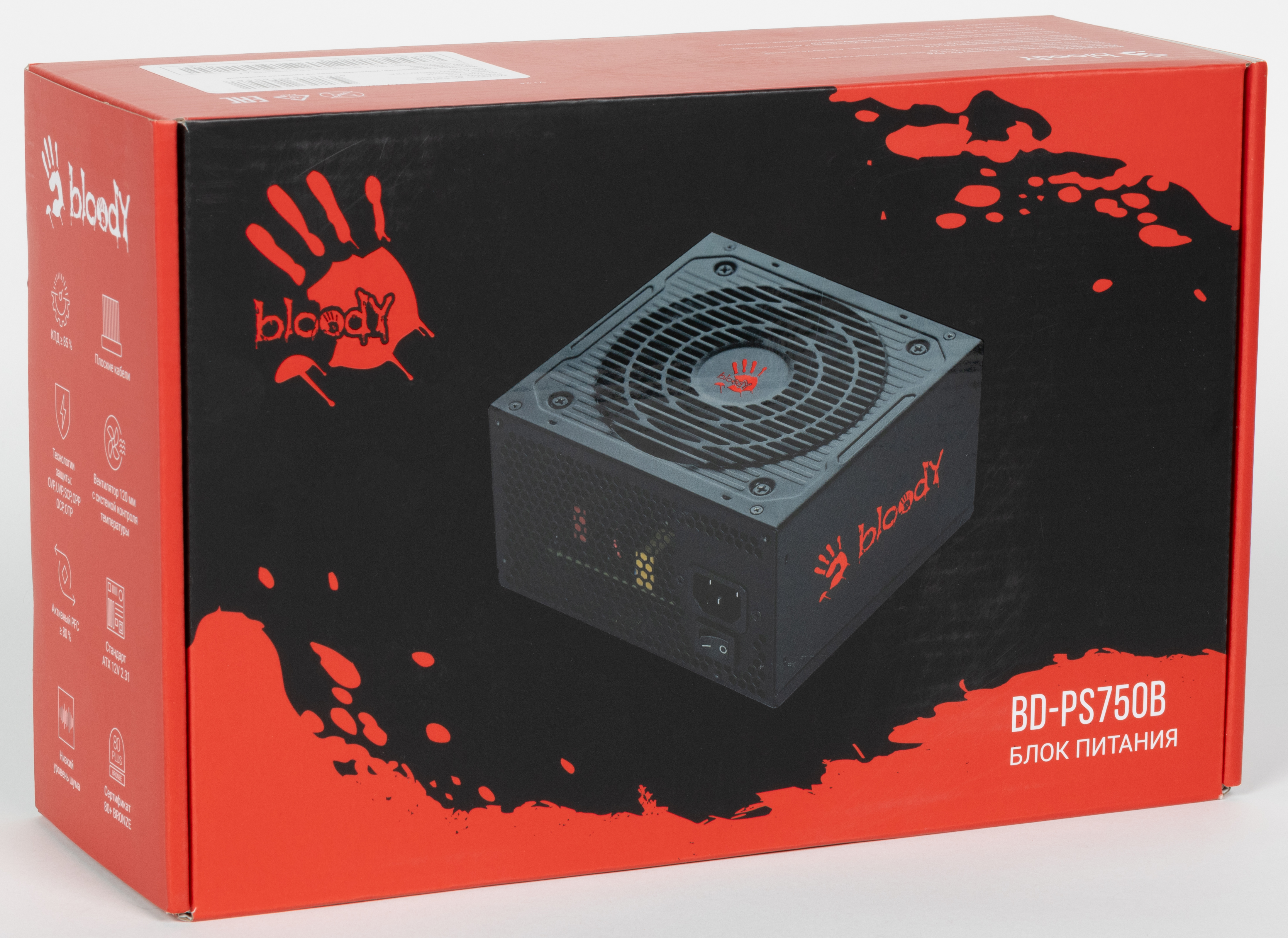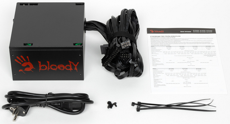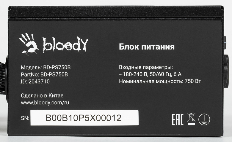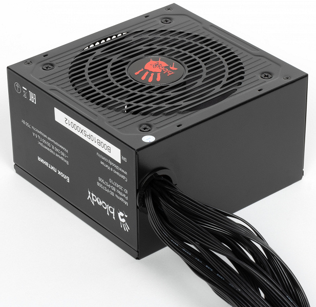 Торговая марка Bloody принадлежит бренду A4Tech, который очень давно выпускает качественную и недорогую игровую периферию. Со временем понятия игровой периферии расширились до компьютерных кресел и мониторов, так что нет ничего удивительно в специальной геймерской линейке блоков питания для компьютеров (очевидно, игровых). Наше знакомство с продукцией данной марки мы начнем с блока питания Bloody BD-PS750B мощностью 750 Вт, который имеет сертификат 80Plus Bronze. В данной серии существуют также модели мощностью 550 и 650 Вт. Это довольно недорогой БП без особых отличительных признаков, не считая агрессивной раскраски. На момент подготовки обзора его стоимость начиналась от 6 тысяч рублей.