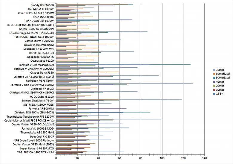 Мы решили выделить несколько типовых вариантов по мощности и соотнести их с количеством разъемов, которое соответствует данным вариантам, то есть максимально приблизить методику измерения экономичности к условиям, которые достигаются в реальном системном блоке. Вместе с тем, это позволит оценивать экономичность разных блоков питания в полностью одинаковых условиях.