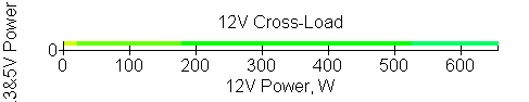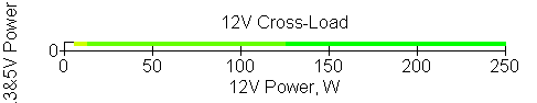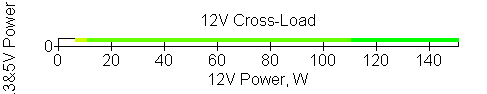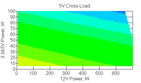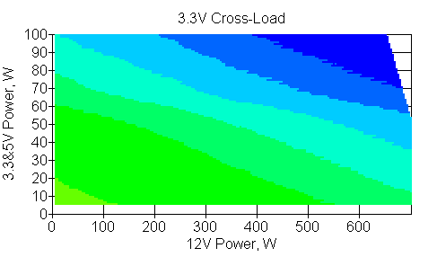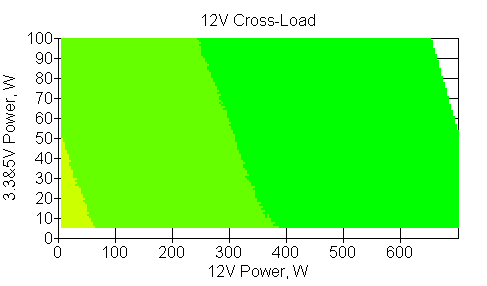 Следующим этапом инструментального тестирования является построение кросснагрузочной характеристики (КНХ) и представление ее на четвертьплоскости, ограниченной максимальной мощностью по шине 3,3&5 В с одной стороны (по оси ординат) и максимальной мощностью по шине 12 В с другой (по оси абсцисс). В каждой точке измеренное значение напряжения обозначается цветовым маркером в зависимости от отклонения от номинального значения.