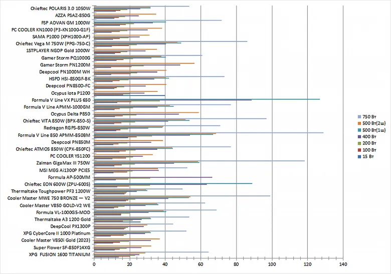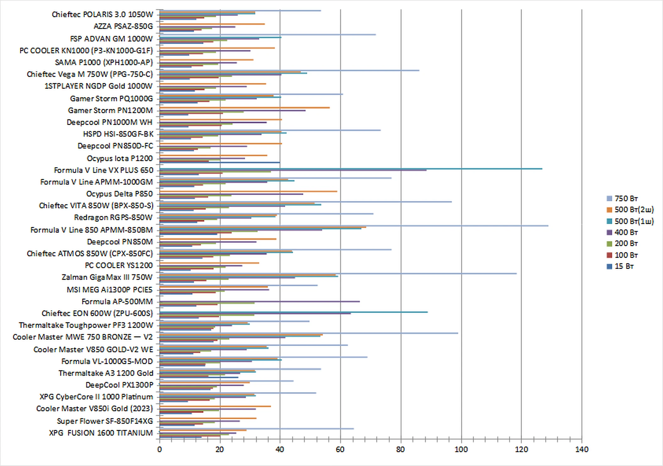 | Thermaltake GF1 1000 | 15,2 | 18,1 | 21,5 | 31,5 | 38,0 | 37,3 | 65,0 |