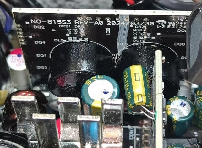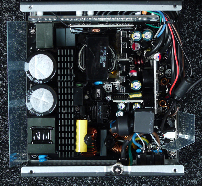 Конструкция блока питания вполне соответствует современным тенденциям: активный корректор коэффициента мощности, синхронный выпрямитель для канала +12VDC, независимые импульсные преобразователи постоянного тока для линий +3.3VDC и +5VDC.