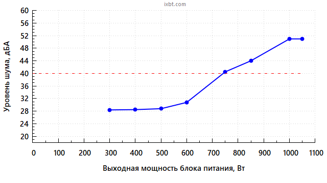 С точки зрения акустической эргономики, блок питания обеспечивает комфорт при выходной мощности в пределах 600 ватт, а до 230 ватт устройство работает с минимально заметным шумом. Однако на максимальной мощности шум высокий, что и неудивительно.