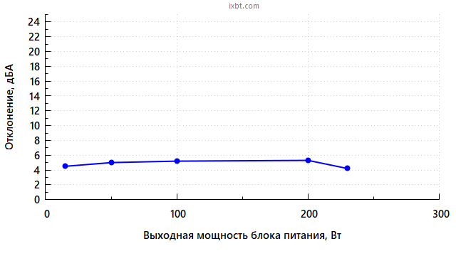 В диапазоне мощности до 230 Вт включительно вентилятор не вращается, а шум блока питания находится на минимально заметном уровне для жилого помещения в дневное время суток (23 дБА и менее), его работу можно считать условно бесшумной.