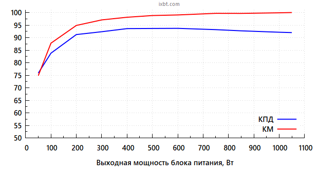 Всего таким образом мы измерили параметры блока питания в 11 точках. В результате максимальный КПД в нашем случае составил 93,7% при выходной мощности 600 Вт. В целом КПД сохраняется выше 90% начиная с мощности около 200 Вт. Максимальная рассеиваемая мощность составила 91 Вт при работе на нагрузку 1050 Вт, что является отличным показателем для блока питания подобной мощности.