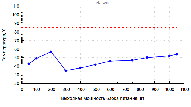 На мощности 230 Вт и менее блок питания может долговременно работать с остановленным вентилятором — как минимум в течение 120 минут. Температура внутри блока питания при этом достигает значения около 59 градусов.