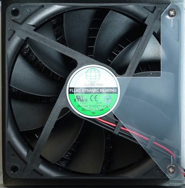 В блоке питания установлен вентилятор Globe Fan RL4Z S1352512HH типоразмера 135 мм, подключение двухпроводное, через разъем.