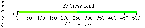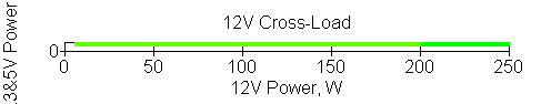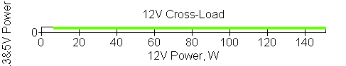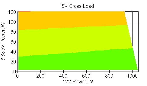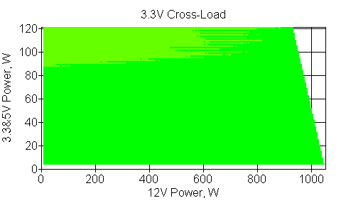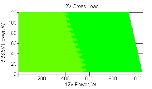 Следующим этапом инструментального тестирования является построение кросснагрузочной характеристики (КНХ) и представление ее на четвертьплоскости, ограниченной максимальной мощностью по шине 3,3&5 В с одной стороны (по оси ординат) и максимальной мощностью по шине 12 В с другой (по оси абсцисс). В каждой точке измеренное значение напряжения обозначается цветовым маркером в зависимости от отклонения от номинального значения.