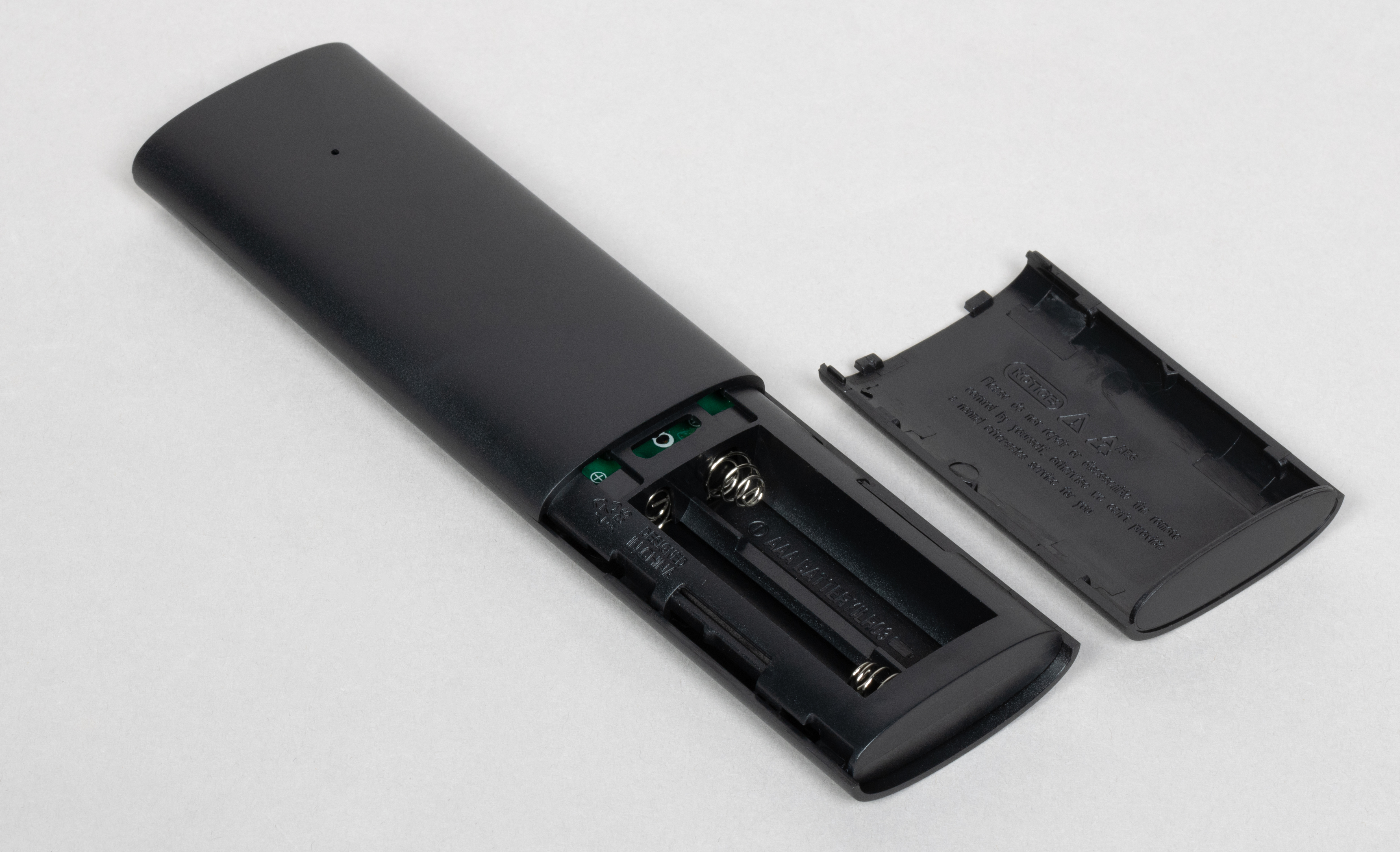 Пульт небольшой и легкий (согласно нашим измерениям 150×40×15 мм и 62 г с элементами питания). Корпус пульта изготовлен из черного пластика с матовой поверхностью. В переднем торце есть вставка из тонированного пластика.