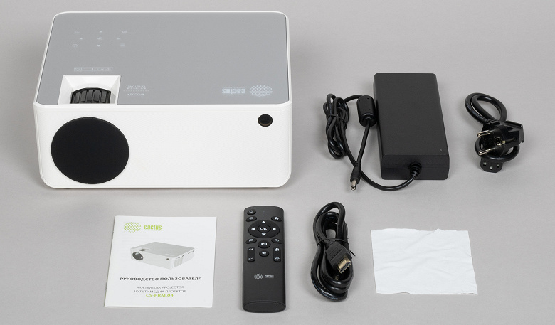 В комплект поставки входят руководство пользователя на русском языке, кабель HDMI, сетевой кабель питания, блок питания, небольшой пульт ДУ, салфетка и крышка на объектив.