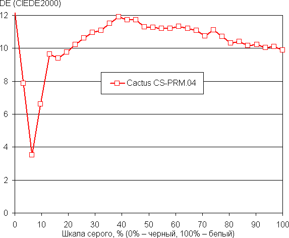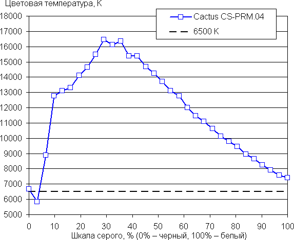 Близкий к черному диапазон можно не учитывать, так как в нем цветопередача не так важна, а погрешность измерения цветовых характеристик высокая. Цветовой баланс средний, так как цветовая температура значительно выше стандартных 6500 К и ΔE выше 10 единиц на большей части шкалы серого, при этом цветовая температура существенно изменяется от оттенка к оттенку на значимой части шкалы серого, что отрицательно сказывается на визуальной оценке цветового баланса.