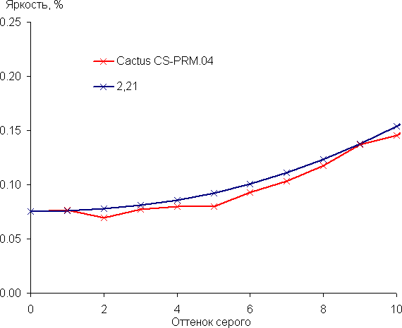 Из графика следует, что рост прироста яркости на большей части шкалы серого более-менее равномерный, и в большинстве случаев следующий оттенок значимо ярче предыдущего. Однако в светах самый яркий оттенок серого по яркости не отличим от белого, а в самой темной области один оттенок немного темнее черного: