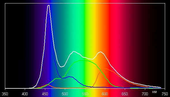 Поэтому цвета выглядят бледноватыми. Ниже приведен спектр для белого поля (белая линия), наложенный на спектры красного, зеленого и синего полей (линии соответствующих цветов):
