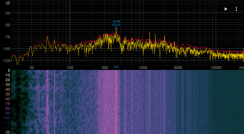 Шум от системы охлаждения высокий, находится рядом с проектором неприятно. Характер звука особого дискомфорта не доставляет, но стрекотание прослушивается. Спектрограмма шума от системы охлаждения демонстрирует ряд пиков с относительно высокой интенсивностью, ответственных за призвук.