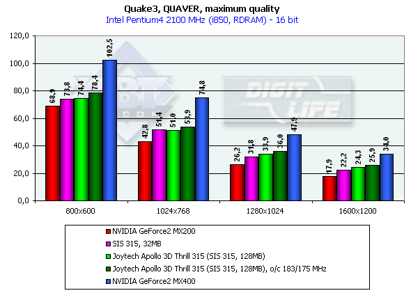А в целом мы видим, что карта обладает скоростью, чуть выше чем у GeForce2 MX200; 128 мегабайт ОЗУ совсем малость, но прибавили производительности. Поэтому если цены на 32- и 128-мегабайтные карты на базе SIS315 будут почти равными, то можно купить и последний вариант, тем более, что пока кроме Joytech таких карт никто не выпускал, а качество платы от этой компании очень высокое.