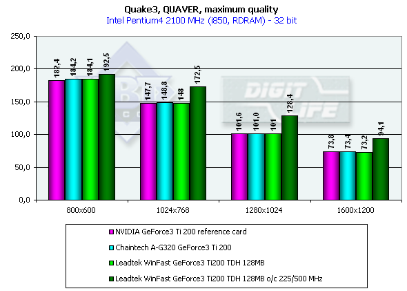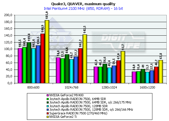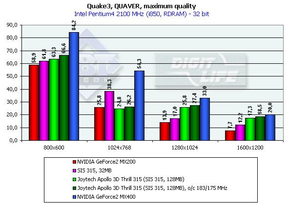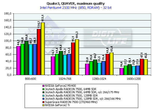 Обратите внимание на то, как сильно отстают эти карты от полноценного RADEON 7500! Плата на базе GeForce2 MX400 хоть и показала чуть худшие результаты, но они почти на уровне Joytech Apollo RADEON 7500 SDR. Поэтому популярность таких «обгрызков» будет полностью зависеть от цен на эти платы.