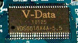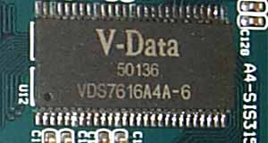 На карте установлены микросхемы памяти марки V-Data, время выборки 6 нс, что соответствует 166 МГц. На этой частоте память и функционирует (в соответствии со спецификацией SIS 315, работающей на частотах 166/166 МГц).