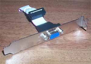 Также отчетливо видно, что обе карты от Joytech очень сильно отличаются от референс-дизайна от ATI (чего, впрочем, и следовало ожидать, раз карты используют другой тип памяти). Интересно отметить, что реализация подключения двух CRT-мониторов у Apollo RADEON 7500 несколько иная, чем у ATI. В комплект поставки входит не переходник DVI-to-d-Sub, а VGA-гнездо на отдельном костыле со шлейфом: