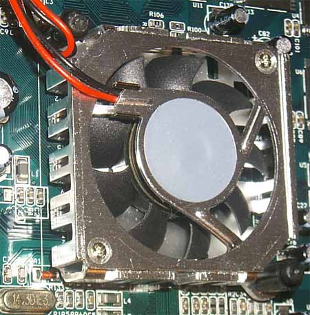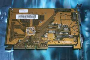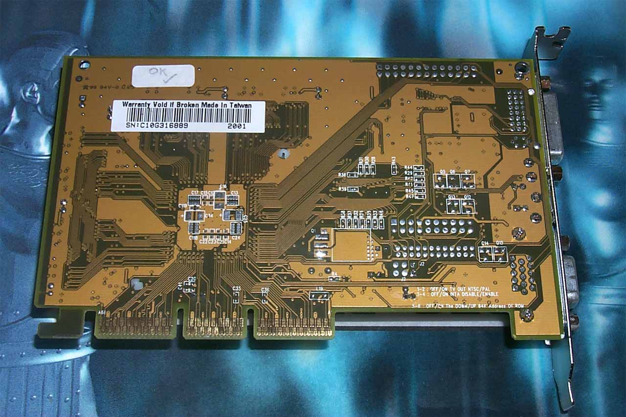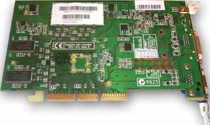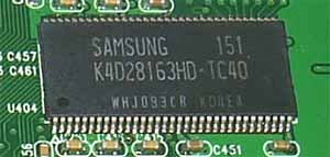 На карте установлены микросхемы памяти марки Samsung, время выборки 4 нс, что соответствует 250 (500) МГц. (При этом, как и положено по спецификации, память функционирует на частоте 200 (400) МГц.) Как видите, используется более быстрая, чем положено для таких плат, память, поэтому можно рассчитывать на приличный разгон (хотя и в меньшей степени, поскольку, как известно, модули памяти от Samsung плохо разгоняются).