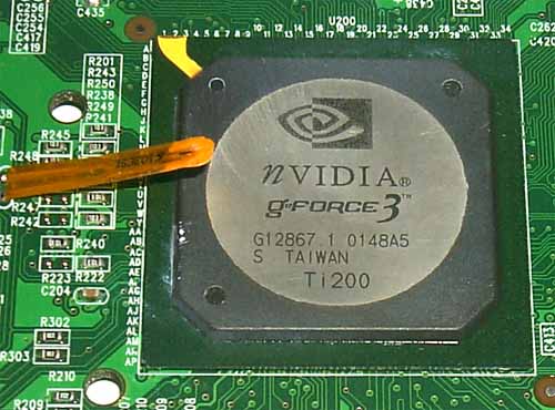PCB имеет текстолит ярко-зеленого цвета, на котором выделяется огромное серебристое охлаждающее устройство (я о нем уже писал в обзоре карт от Leadtek на основе GeForce3 Ti 200/500, это единый радиатор для охлаждения памяти и чипа). Под радиатором находится графический процессор (ныне маркировка Ti 200 уже наносится на крышку чипа):