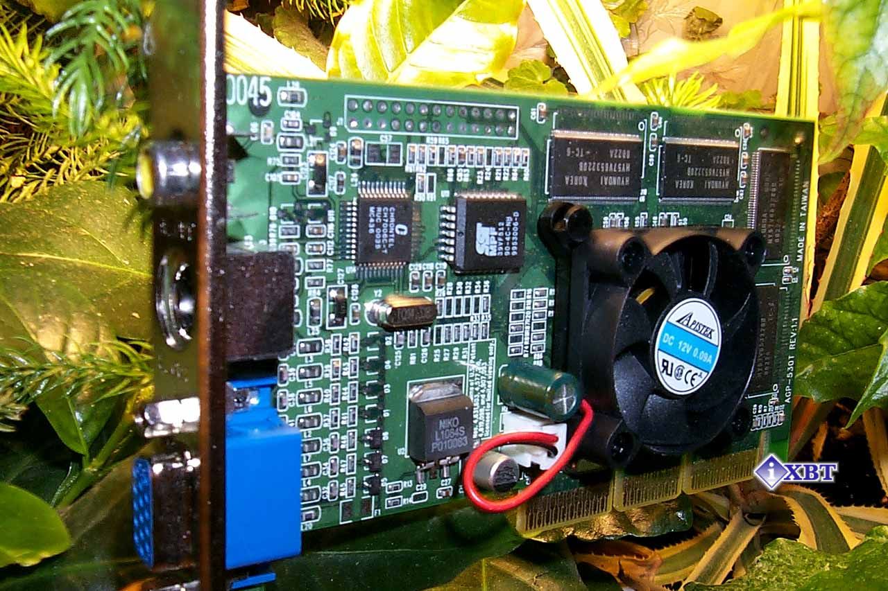 Возвратимся к размерам. Так вот, сходство с картами на базе Riva TNT2/TNT2M64 — налицо, причем, если кто помнит, даже память используется того же типа (SDR). Почему такой упор я делаю на этом сходстве? Дело в том, что уже есть случаи продаж видеокарт на базе чипов Riva TNT2 под видом карт на базе GeForce2 MX. Умельцы из "полуподвальных" фирмочек прошивают в эти карты модифицированный BIOS, так что купивший карту пользователь сходу и не догадывается о подлоге и считает, что купил GeForce2 MX. Эта тема уже обсуждалась и в конференции iXBT, где в качестве признака внешнего отличия "правильных" видеокарт назывался эталонный дизайн от NVIDIA, при котором все модули памяти расположены справа от GPU, а PCB может быть или узкой (при отсутствии дополнительных элементов вроде TV-out), или полноразмерной с очень большой площадью пустого пространства выше модулей памяти, не занятого элементами логики.