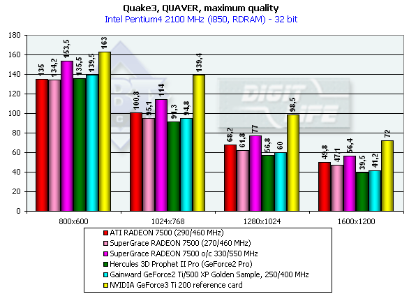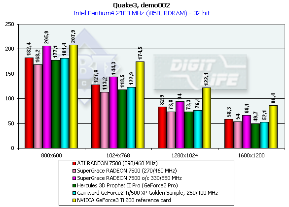 - Как следствие п.1, мы не имеем никаких проблем с 2D-качеством у обеих карт (да и не будем иметь как показывает опыт, практически все продаваемые видеокарты на RADEON 7500/8500 представляют собой точно такие же карты).