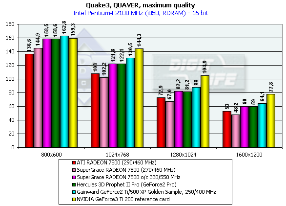 Интересно отметить, что с усложнением графики и увеличением нагрузки на графический процессор RADEON 7500 оказывается в более выгодном положении, чем соперники от NVIDIA, несмотря на более низкий филлрейт у первого (как говорится, HyperZ «рулит»). Разумеется, речь идет о 32-битном цвете (в 16-битном поражение изделия от ATI очевидно). Однако если оригинальная ATI RADEON 7500 обыгрывала карты на GPU от NVIDIA, то SuperGrace RADEON 7500 уже находится на их уровне (в среднем). Опять сыграло свою негативную роль снижение частоты работы этой карты. Заметим, что очень сильное повышение частоты памяти и особенно чипа при разгоне принесло не так много дивидендов, как ожидалось.