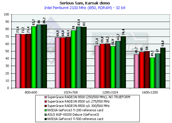 - Serious Sam v.1.05 (Croteam) игровой тест, демонстрирующий работу платы в OpenGL с использованием стандартного демо-бенчмарка Karnak demo (настройки для 32-битного цвета приведены ниже, в случае 16-битного цвета три позиции в настройках меняются, соответственно, на 16-bit).