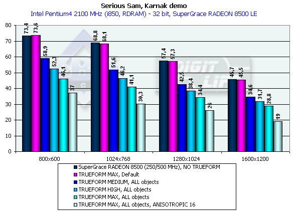 В этом разделе мы рассмотрим не только производительность самих исследуемых ныне карт, но и работу TRUFORM у RADEON 8500, а также затронем немного анизотропию совместно с TRUFORM.