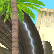 Некоторые грубоватости заметны (все же авторы 3DMark2001 очень изящно выполнили свой одноименный тест), однако они почти не мешают наслаждаться видом текущей воды, в которой плавают рыбы (иногда выпрыгивают). Здесь пена от водопада выполнена более натурально, чем в демонстрационной программе Waterfall и не портит картину.
