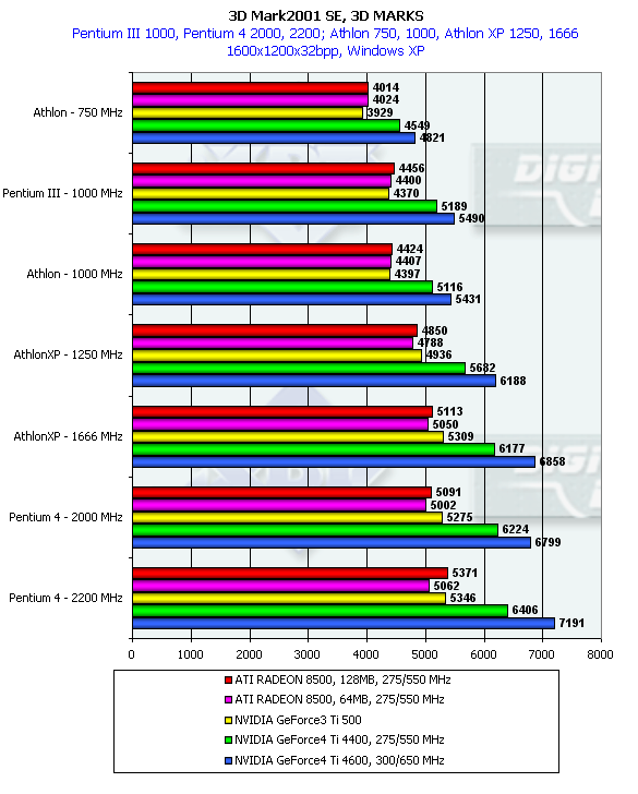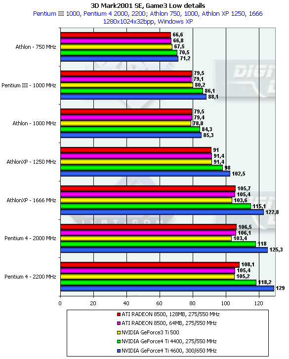 И вот только это разрешение нам продемонстрировало, что у GeForce4 Ti гораздо более высокий потенциал по работе с шейдерами, чем у RADEON 8500, когда влияние центрального процессора уменьшилось.