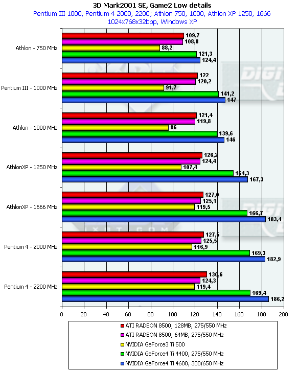 Однако данный тест является исключением из того правила, которое я выразил абзацем раньше. Можно заметить, что GeForce3 Ti 500 на младших процессорах уже обгоняет семейство RADEON 8500, тогда как на платформах с очень мощными CPU эта карта отставала. Что касается GeForce4 Ti, то очевидно, что приобретать такие карты владельцам систем с CPU менее 1.5ГГц — бесполезно (впрочем, об этом уже я говорил и ранее).