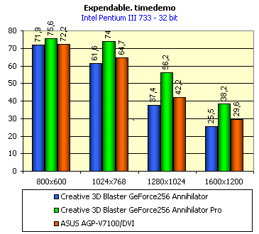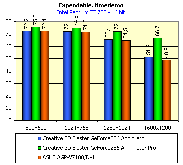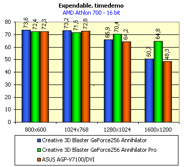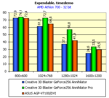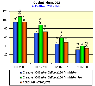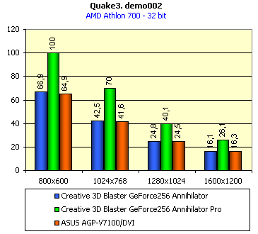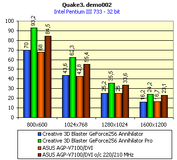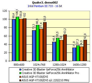 Предваряя результаты, хочу сразу отметить, что обе карты показали совершенно одинаковую производительность, отличия были настолько незначительными, что нет никакого смысла на диаграммах показывать обе платы, поэтому ниже представлены результаты ASUS AGP-V7100/DVI.