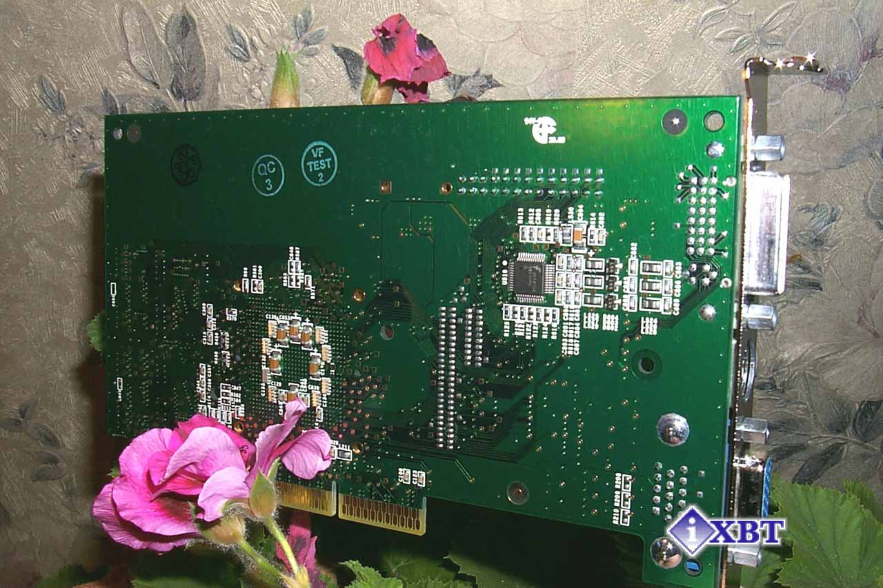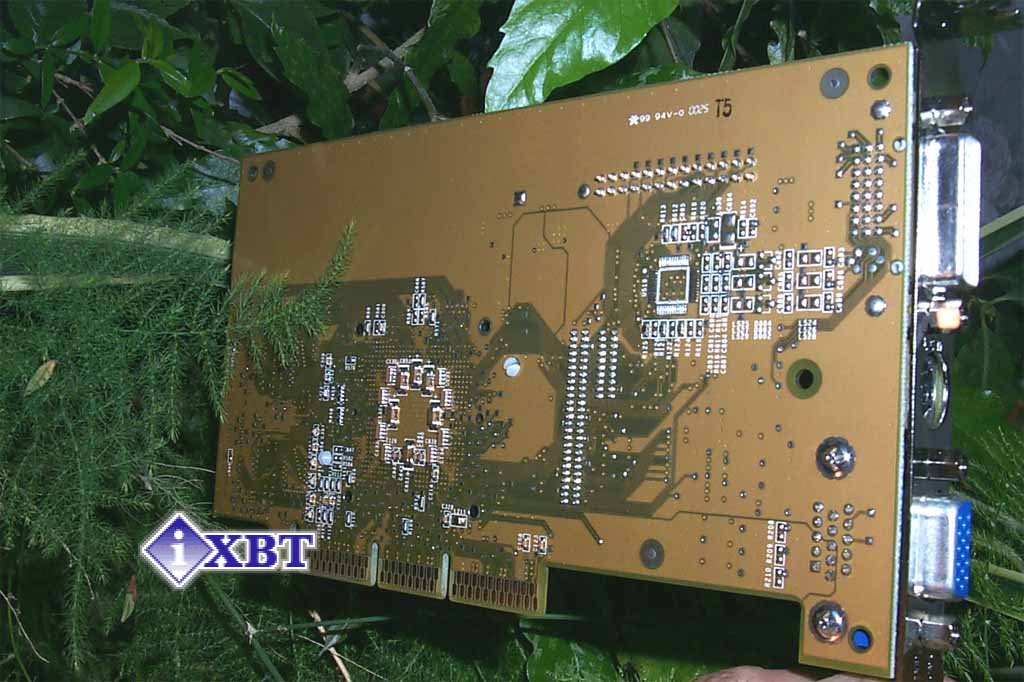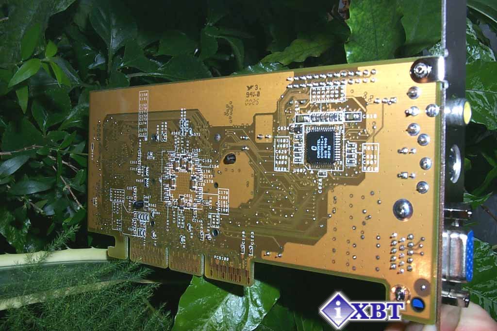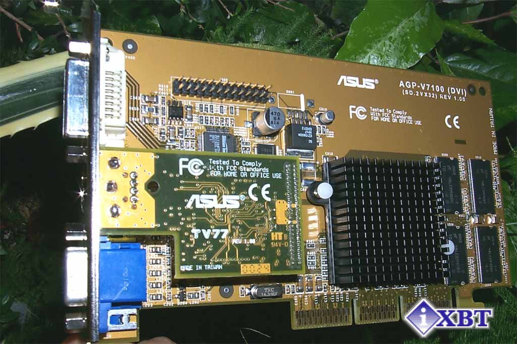 Дальнейший осмотр PCB трех карт показал, что различие между ними есть как в размере самих плат, так в способе монтажа TV-out. Если у ASUS AGP-V7100/DVI и референсной карте TV-out разведен на дочерней карте, то у ASUS AGP-V7100/T он установлен на основной PCB, причем микросхема Chrontel расположена на оборотной стороне PCB. Однако в последнем случае TV-out представлен не только выводом типа S-Video, но и RCA-разъемом. Для активизации TV-out, если у пользователя нет видеоаппаратуры, принимающей сигнал S-Video, потребуется переходник. Как следует из названия, видеокарты ASUS AGP-V7100/DVI и референсная плата обеспечивают подключение к ним цифровых мониторов с интерфейсом DVI. На плате от ASUS TV-out обеспечивает также микросхема Chrontel, а на референсной — BrookTree. Все платы от ASUS имеют насыщенно-желтый цвет, а референсная плата ярко-зеленого цвета.