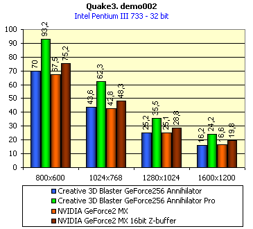 К сожалению, референсная плата от NVIDIA к нам попала позже, чем карты от ASUS, поэтому рассмотрение работы Z-буфера я делал на основе эталонной карты. Как уже я отмечал в особенностях видеокарт на базе этого чипсета, они позволяют при работе в 32-битном цвете средствами игры переключать глубину цвета у Z-буфера в 16 бит (по умолчанию все остальные платы на чипсетах от NVIDIA включают 24-битный Z-буфер при работе с 32-битной графикой и 16-битный при работе с 16-битной графикой). Например, в Quake3 можно при помощи переменной r_depthbits установить значение "16" для Z-буфера при работе с 32-битной графикой (например, режим High Quality):