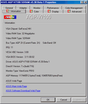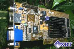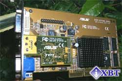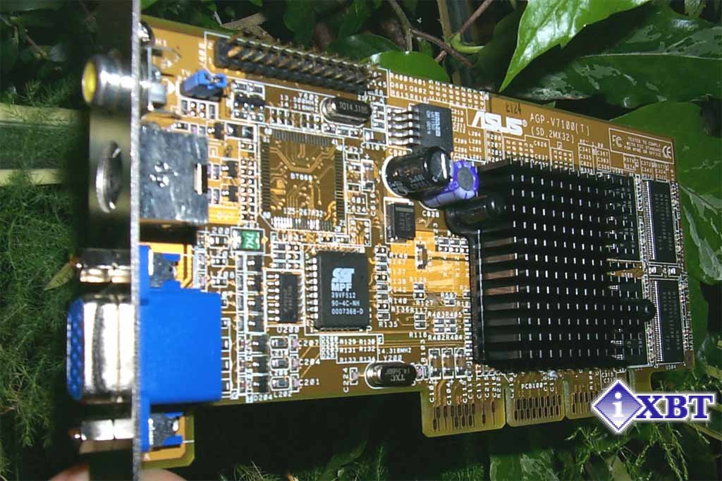 Весьма интересной особенностью данных плат является отсутствие активного кулера у видеокарт ASUS AGP-V7100 и наличие всего лишь игольчатого радиатора, правда, большого размера. Конечно, можно говорить о чрезмерной экономии фирмы на однодолларовых вентиляторах, однако испытания показали, что чип GeForce2 MX практически остается лишь теплым после продолжительной интенсивной работы, поэтому такого радиатора вполне достаточно. При гораздо меньшем объеме кристалла корпус у чипсета NVIDIA GeForce2 MX имеет такие же размеры, как и у GeForce2 GTS, поэтому охлаждение происходит лучше. На платах ASUS AGP-V7100, которые являются опытным образцами, установлен чип, имеющий еще кодовое имя NV11: