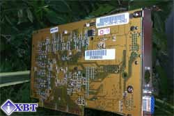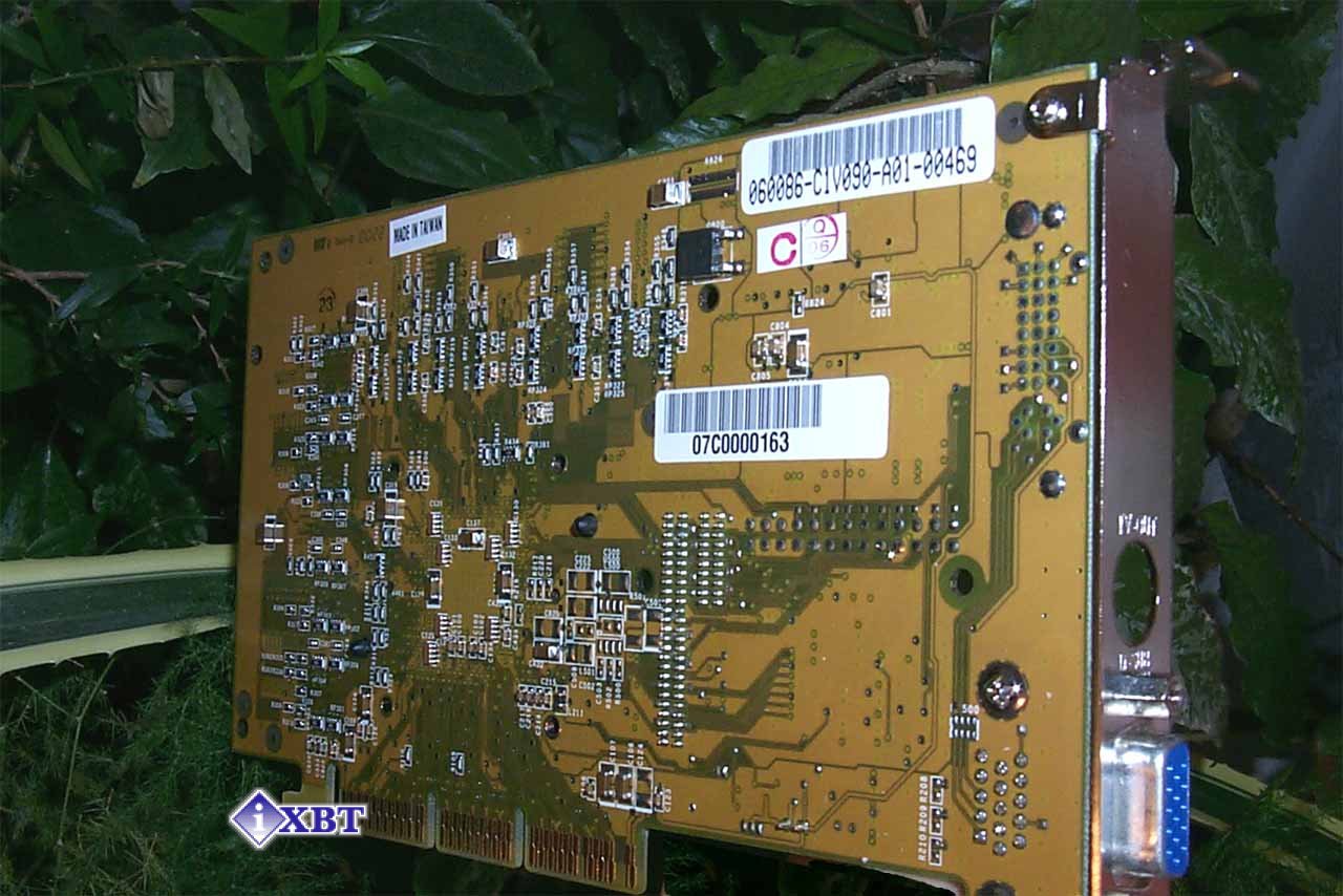 Плата имеет насыщенно-желтый цвет. На PCB имеются разъемы для монтажа дочерней карты с TV-out (самой карты нет). Также на видеокарте предусмотрено пустое место для установки разъема для подключения цифровых мониторов.
