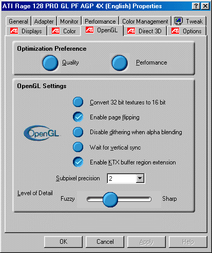 OpenGL. Тут мы можем также включать/выключать VSync, регулировать уровни субпиксельной коррекции и детализации текстур, включать конвертацию 32-битных текстур в 16-битные, выключать dithering (эффект сглаживания переходов между цветами) при альфа-смешении (работе с полупрозрачными объектами), а также для 3D Studio MAX включить поддержку расширения KTX_Buffer_region.