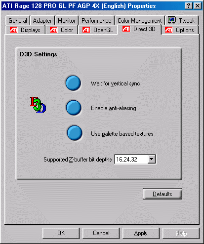 Direct3D. Имеется возможность по регулировке установок режим VSync, разрядности Z-буфера, включению эффекта сглаживания (anti-aliasing) и поддержки палетизированных текстур.