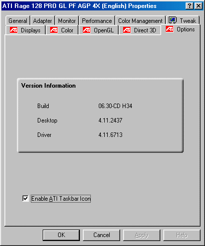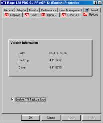 Для тестирования были использованы драйверы версии 6.30 CDH34, которые являются общими для обоих чипсетов (RAGE 128 и RAGE 128 PRO). Процесс установки весьма тривиален и не вызвал затруднений. После успешной инсталляции мы получили в окне свойств экрана следующие закладки: