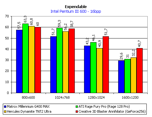 - Rage Expendable — игровой тест, встроенное демо timedemo, в котором мы получим представление о работе акселератора в Direct3D в режиме мультитекстурирования при глубине цвета в 16 и 32 бит.