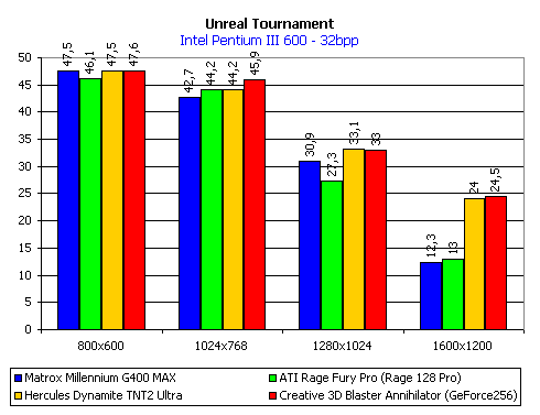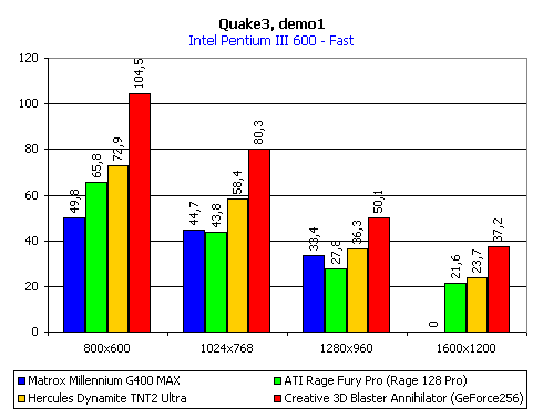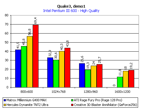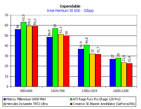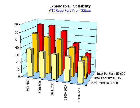 Эта игра требует наличия в системе скоростного процессора. Даже при использовании Intel Pentium III с частотой 600 МГц наблюдается его недостаточное быстродействие, результатом которого является то, что в разрешениях 800х600 и даже 1024х768 большее влияние на количество fps оказывает не видеоакселератор, а CPU. Тем не менее, должен отметить, что ATI RAGE 128 PRO стала существенно отставать от конкурентов только в разрешении 1600х1200, занимая в остальных разрешениях позицию близкую к Matrox Millennium G400 MAX.