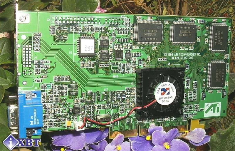 На чипсете приклеен активный вентилятор с радиатором небольшого размера. Более ничем внешний вид этой платы не выделяется. Семейство RAGE FURY PRO состоит из 4-х видеокарт:
