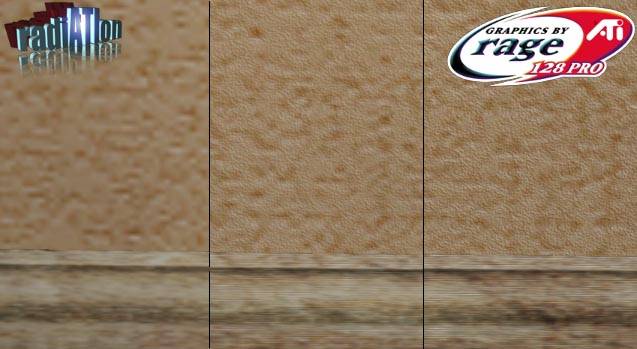 Теперь вспомним о том недостатке, который был присущ ATI RAGE 128, и которого никто не хотел видеть - ужасно реализованная билинейная фильтрация с бандингом (полосатостью). Слева будет показан этот недостаток у ATI RAGE 128, а справа — то, что мы можем видеть у ATI RAGE 128 PRO: